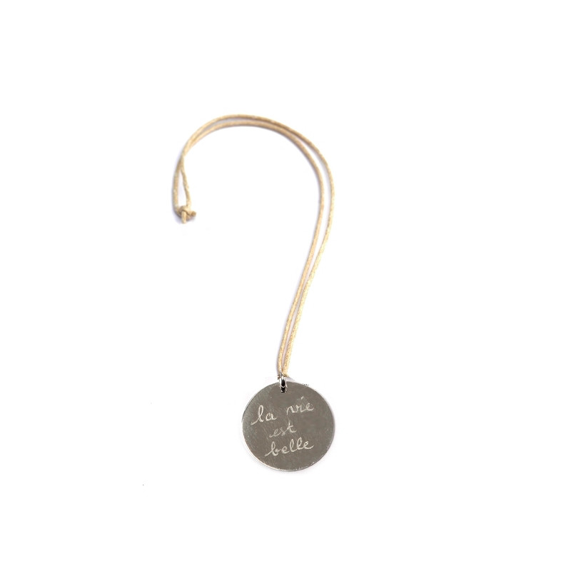 Ce collier, en argent ou en plaqué or, est le plus petit de la famille des colliers gravés et peut être porté par les mamans comme par les filles. Il est monté sur un lien avec noeuds coulissants. Un joli cadeau ! Ce collier devient un bijou à part entière avec sa chaine en argent ou en plaqué or (onglet "accessoires"). 2 longueurs de chaine : 40 ou 60 cm...