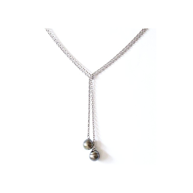 Un collier très féminin à nouer comme un lasso autour du cou. Se porte long ou court. Le collier est composé de 2 perles cerclées de TAHITI (remis avec certificat d'authenticité) en forme de goutte baroque. La chaine est en argent 925°/°. Un bijou qui se porte en soirée façon cravatte ou sautoir "habillé" ou au quotidien sur un chemisier ou un pull. Et surprenez, portez le en ceinture aussi !