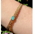 Jonc très travaillé fait d'une tresse avec 1 pierre colori turquoise au centre. En plaqué or. Très délicat au bras. Proposé en corail.
