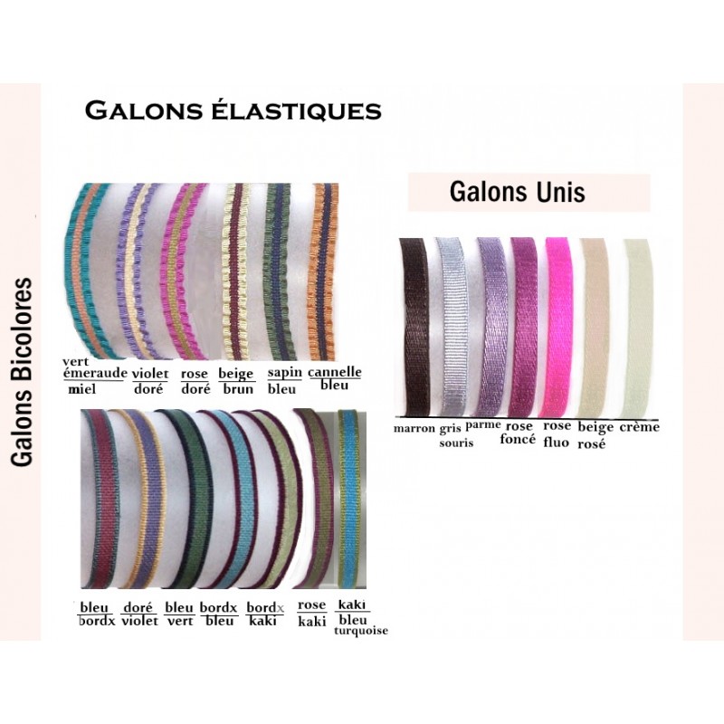 Achetez un joli galon élastique et glissez une médaille ou breloque. Plats ou froncés. Vendus prédécoupés 20 cm. 4, 6 ou 11 mm de largeur. cf photo. Prix dégressif par 4 (50%). Choisir le premier colori, quantité (1= galon 20cm), valider panier, continuer achats, renouveler pour les autres galons souhaités. Breloques et charms proposés en bas de page....