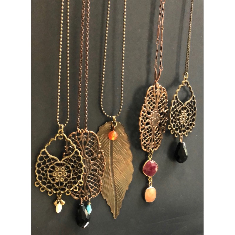 Sautoirs en métal cuivré vieilli composé de motifs ajourés et de pierres. Très bel effet sur un chemisier ou un pull. A porter sans modération en journée comme en soirée !